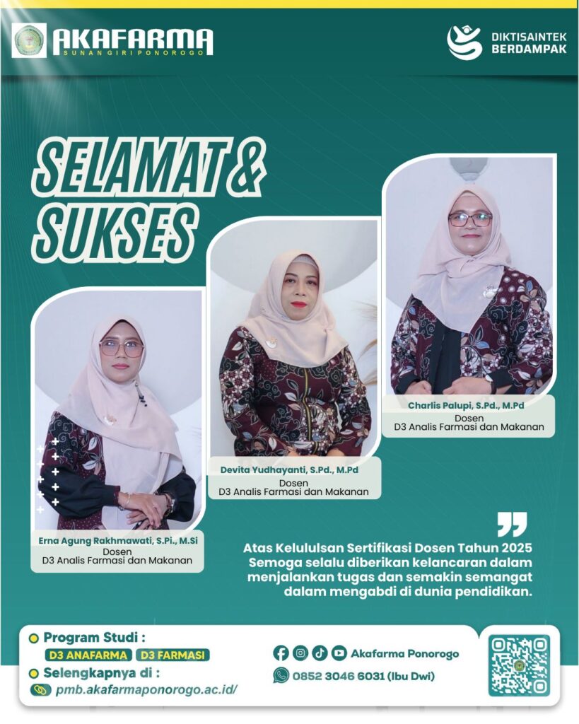 18 September 2025 – PONOROGO – AKAFARMA sunan Giri Ponorogo kembali mencatatkan prestasi gemilang di bidang sumber daya manusia. Tiga dosen berhasil menyelesaikan dan dinyatakan lulus Sertifikasi Dosen pada gelombang 1 tahun 2025. Mereka adalah Erna Agung Rakhmawati, S.Pi., M.Si. , Devita Yudhayanti, S.Pd., M.Pd., dan Charlis Palupi, S.Pd., M.Pd.
